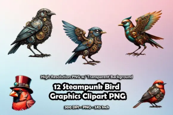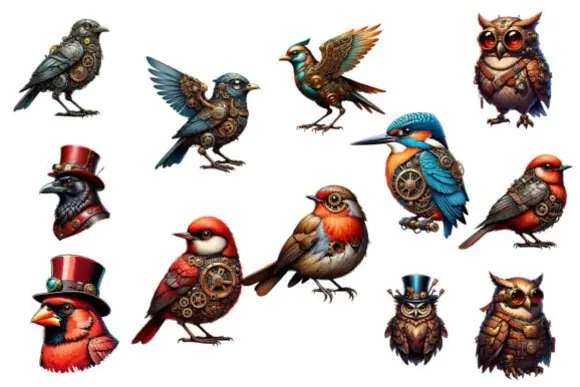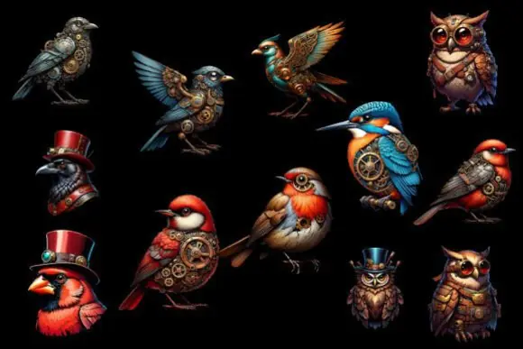 Add a touch of vintage machinery and fantasy charm to your creative work with this stunning 12 Steampunk Bird Graphics Clipart PNG Bundle. This imaginative collection features 12 unique bird illustrations reimagined in a captivating steampunk style, blending nature with mechanical elegance.