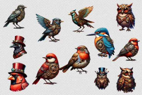 Each bird design showcases intricate details such as brass feathers, clockwork wings, gear-lined tails, and whimsical industrial-inspired elements, making this bundle perfect for projects that need a bold, artistic, and imaginative aesthetic. These high-resolution PNG files come with transparent backgrounds, allowing for effortless layering and easy integration into a wide range of digital and print creations.