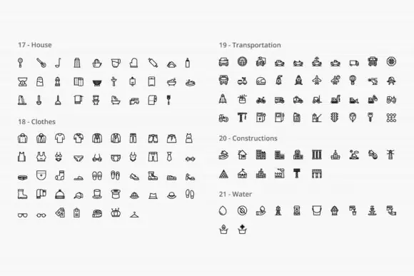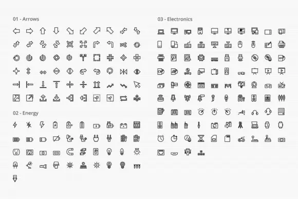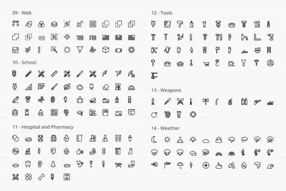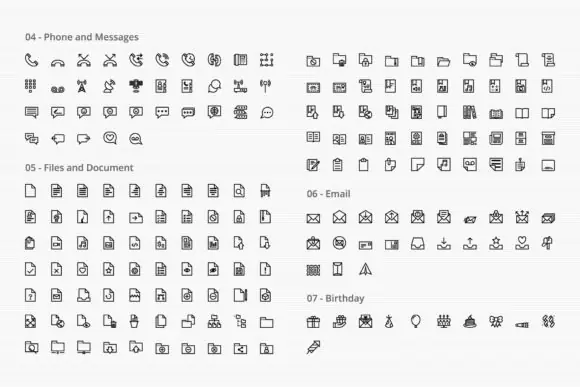 This bundle covers an impressive variety of subjects including arrows, energy, electronics, phone and messages, files and documents, email, birthday, economy, web, school, hospital and pharmacy, tools, weather, food and drinks, humans, house, clothes, transportation, sports and games, media, personal care, fauna, flora, hand gestures, sea, baby, shipping and delivery, and more. This wide coverage makes it an excellent choice for both general-purpose design work and more specialized creative projects.