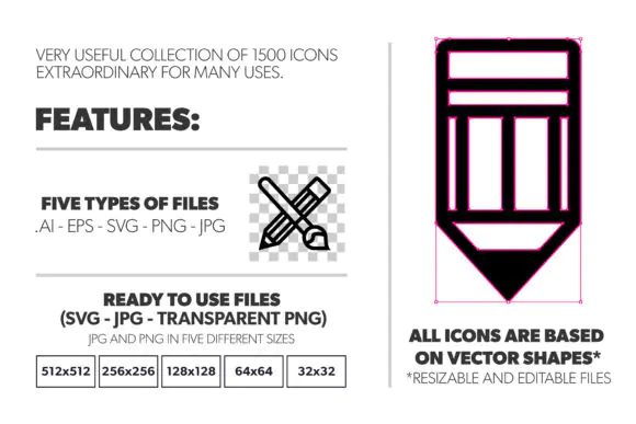 All icons are based on vector shapes, making them fully resizable and editable. The pack includes AI, EPS, SVG, PNG, and JPG files, giving you flexibility across many different design tools and workflows. Ready-to-use JPG, SVG, and transparent isolated PNG files are included, with black and white variations available. The JPG and PNG files are provided in five sizes: 512×512, 256×256, 128×128, 64×64, and 32×32, which makes the set especially useful for UI design, apps, web graphics, and print layouts.