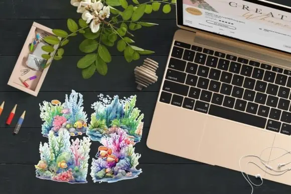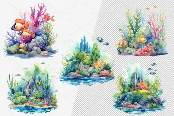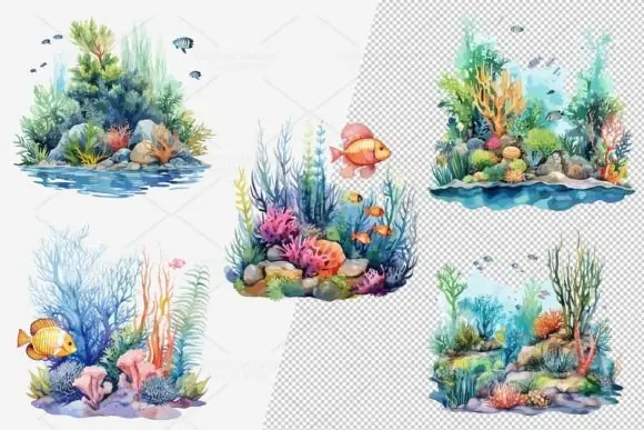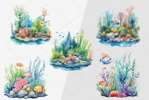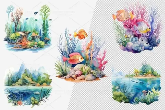 These underwater graphics are great for creating scrapbook pages, wall art, DIY greeting cards, special occasion invitations, mug designs, print-on-demand products, crafts, gifts, social media posts, t-shirt designs, stickers, and many other creative projects. The watercolor style adds a soft and artistic look that makes your designs feel fresh, whimsical, and visually engaging.