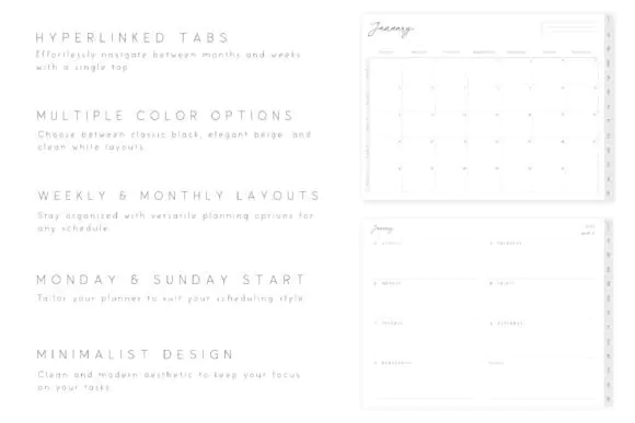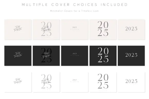 This planner comes as a hyperlinked PDF, making it easy to move between sections with a simple tap. It includes annual, monthly, and weekly calendar layouts covering January through December 2025, giving you a practical structure for full-year planning. Users can also choose between Monday-start and Sunday-start layouts depending on their preferred planning style.
