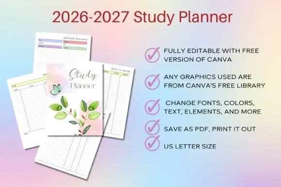 Plan the academic year with confidence using this 2026–2027 Study Planner Canva Template. This editable student planner is designed to help learners organize study schedules, assignments, exams, projects, course materials, deadlines, reading goals, revision plans, resources, grades, and academic progress from July 2026 to June 2027.