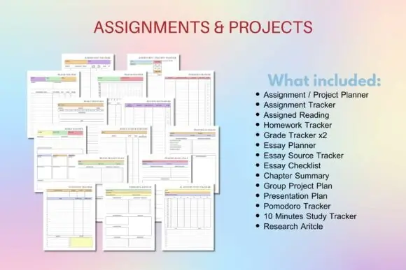 Assignment/Project Planner, Assignment Tracker, Assigned Reading, Homework Tracker, Grade Tracker, Essay Planner, Essay Source Tracker, Essay Checklist, Chapter Summary, Group Project Plan, Presentation Plan, Pomodoro Tracker, 10-Minute Study Tracker, and Research Article pages.