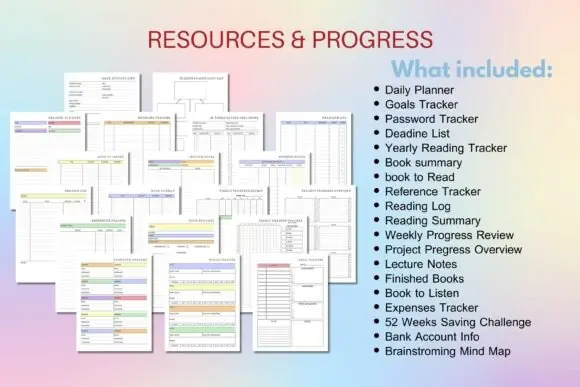 Daily Planner, Goals Tracker, Password Tracker, Deadline List, Yearly Reading Tracker, Book Summary, Books To Read, Reference Tracker, Reading Log, Reading Summary, Weekly Progress Review, Project Progress Overview, Lecture Notes, Finished Books, Books To Listen, Expenses Tracker, 52-Week Saving Challenge, Bank Account Info, and Brainstorming Mind Map.