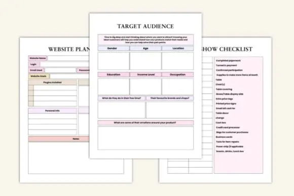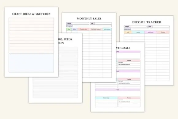 Inside, you’ll find a wide range of useful business planning pages, including yearly, monthly, and weekly planners, a creative goal tracker, budget, income, and expense trackers, product and inventory management pages, website and marketing planner, order and customer management tools, craft ideas and sketch pages, branding and launch checklist, sales and competitor analysis, and donation, investment, and tax logs. These pages make it easier to manage stock, pricing, promotions, customer records, finances, and product development all in one organized planner.