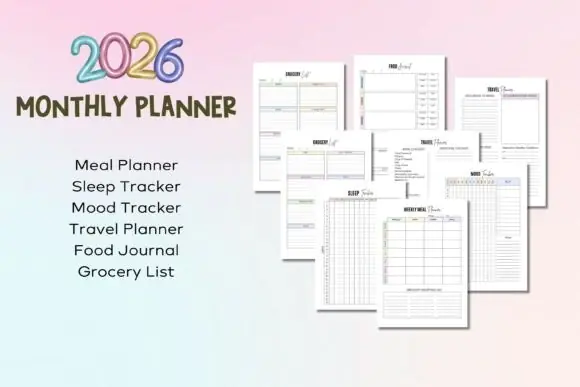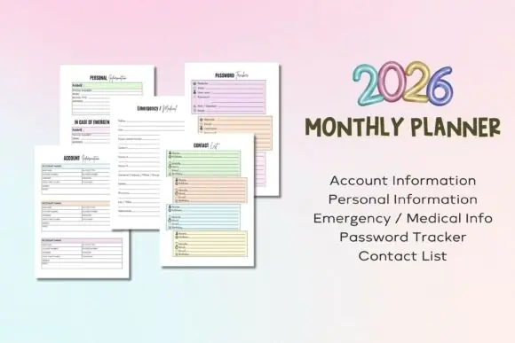 This bundle includes more than 40 editable Canva templates in A4 size, giving you the freedom to build unlimited planner combinations. Inside, you’ll receive useful pages such as 2 different covers, account information, contact list, password tracker, yearly overview, yearly plan, future log, important dates, monthly at a glance pages for all 12 months, weekly planner pages, weekly tracker pages, daily planner, habit tracker, budget planner, meal planner, grocery list, sleep tracker, mood tracker, food journal, travel planner, and a 2026 calendar. This makes it a versatile planner for organizing schedules, habits, wellness, finances, and daily routines all in one place.