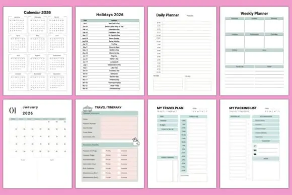 Inside, you’ll find a wide range of useful travel planning pages, including belongs to pages, 2026 calendar, 2026 holidays, 2026 monthly planner, my travel plan, my packing list, places to visit, travel journal pages, travel planner pages, travel itinerary pages, daily itinerary, itinerary tracking, travel guide, travel bucket list, travel checklist, my travel destination, vacation travel checklist, expense tracker, vacation planner, pre-trip planner, journey road map pages, travel budget, destination information, travel information, travel daily planner, travel expense tracker, shopping list, grocery list, plan your travel, plan for today, to-do list, and notes. This gives you a complete system for planning before the trip, staying organized during the trip, and documenting the experience afterward.