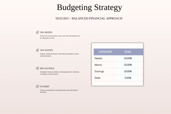 The 50/25/20/5 budgeting system divides your income into four clear categories: 50% for needs, 25% for wants, 20% for savings, and 5% for debt repayment. This structure is ideal for anyone who wants a clear, flexible, and realistic way to manage money without feeling overwhelmed.