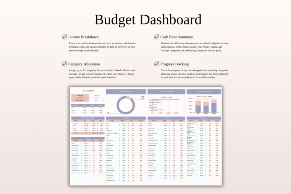 A clean financial dashboard gives you a simple overview of your income, expenses, savings, debt repayment, and overall budget progress.