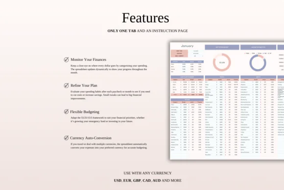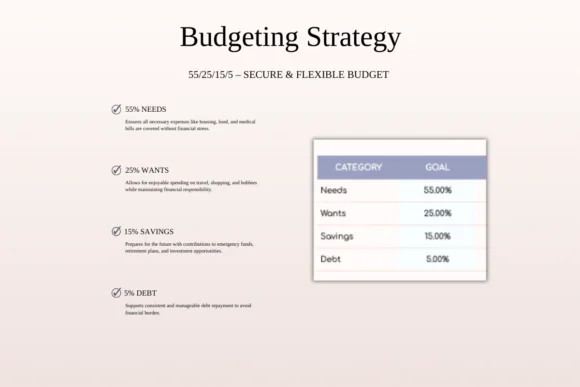 The 55/25/15/5 structure is flexible enough for different lifestyles while still giving your finances a clear direction. You can adjust categories, track progress, and use the spreadsheet as a monthly money management system that supports both comfort and long-term growth.