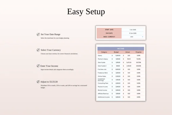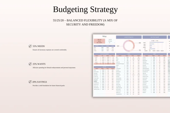 Create a balanced and flexible money routine with this 55/25/20 Budget Spreadsheet Template. Designed for Google Sheets and Microsoft Excel, this easy-to-use budgeting tool helps you manage your income using the Balanced Flexibility method, a simple approach that gives structure to your finances while still leaving room to enjoy life.