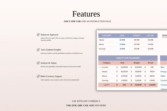 The simple three-category structure makes budgeting easier to understand and maintain. You can use it to track spending, plan monthly income, control expenses, build savings, and create a repeatable money routine that fits real life.