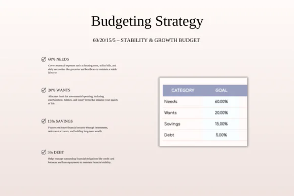 This budgeting system divides your income into four simple categories: 60% for essentials, 20% for lifestyle, 15% for savings, and 5% for debt repayment. It is ideal for anyone who wants to prioritize essential living expenses, save consistently, manage debt, and still leave room for enjoyable spending.