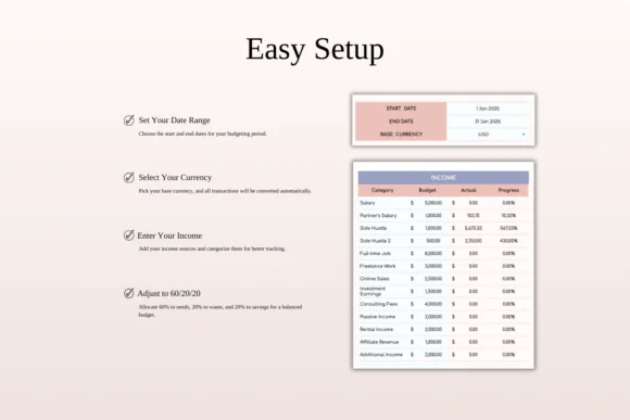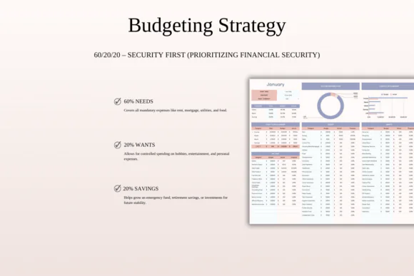 Prioritize financial security while still enjoying life with this 60/20/20 Monthly Budget Spreadsheet Template. Built around the simple and practical 60% needs, 20% wants, and 20% savings budgeting rule, this spreadsheet helps you organize your income, control spending, and plan for future financial goals with confidence.