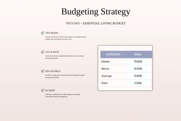 The 70/15/10/5 budgeting method divides your income into four simple categories: 70% for needs, 15% for wants, 10% for savings, and 5% for debt repayment. This structure is ideal for individuals and families who want a realistic budget that focuses on stability first, while still supporting long-term financial progress.