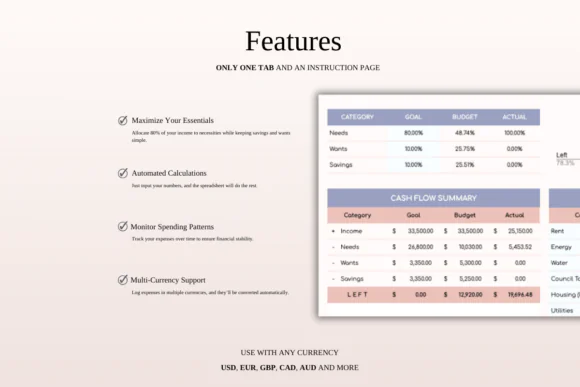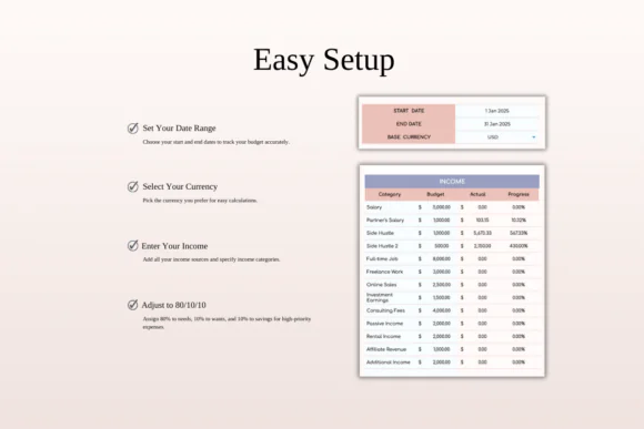 Customize income, expense categories, savings goals, and budget details to fit your real financial situation.