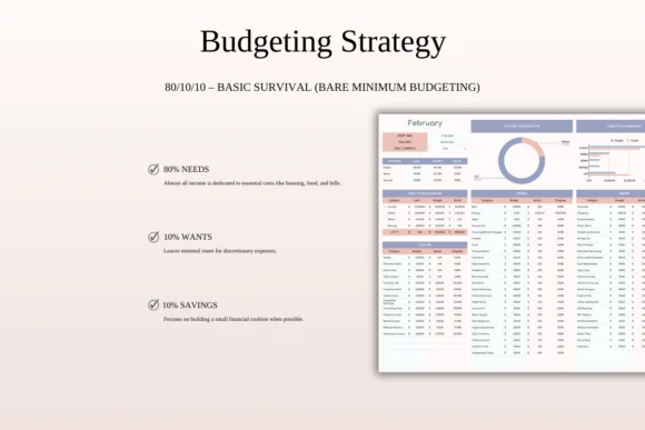 Manage your money with a simple, practical system using this 80/10/10 Budget Spreadsheet Template for Excel and Google Sheets. Designed around the basic survival budgeting method, this template helps you focus first on essential expenses while still allowing a small portion for personal wants and future savings.