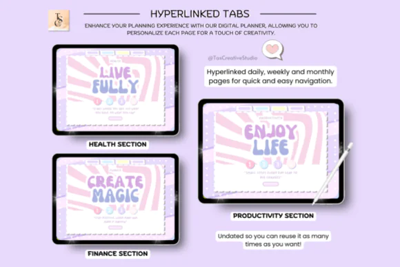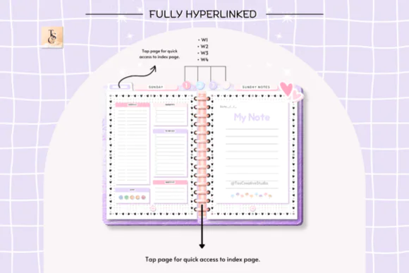 This planner includes hyperlinked daily, weekly, and monthly pages for quick and simple navigation. Because it is undated, you can start using it at any time and reuse it as often as needed. The package includes 1 fully hyperlinked 60-page horizontal planner along with instructions and guides, making setup easy for digital planner users.
