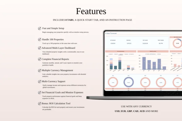 The Airbnb Income & Expense Spreadsheet is a complete financial tracking system for short-term rental businesses. With property dashboards, income and expense tracking, ROI tools, tax reporting, and 5-year forecasting, it helps hosts and property managers stay organized, understand profitability, and make smarter data-driven decisions.