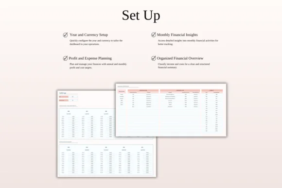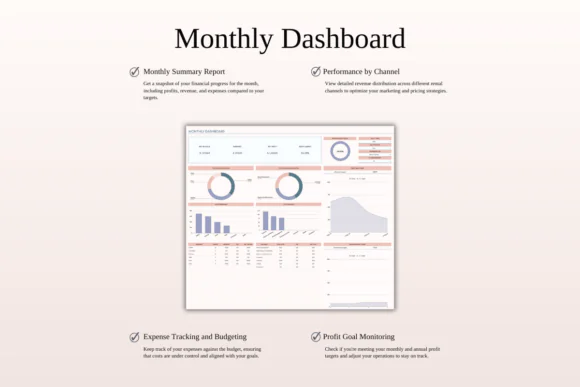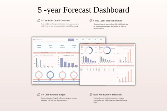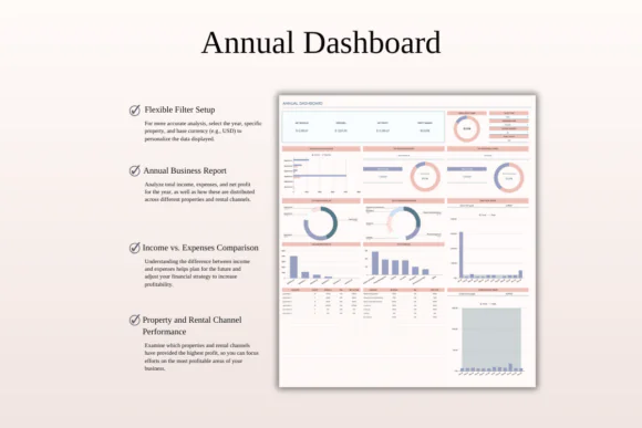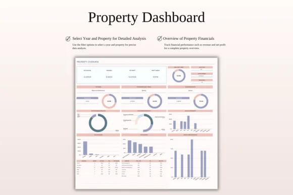 The included multi-layered property dashboard gives you a complete view of your rental business. You can analyze monthly performance, annual income and expenses, top-performing properties, best booking channels, profit goals, expense budgets, and long-term financial growth. The 5-year financial forecast dashboard helps you plan future profitability and understand how your rental business may grow over time.