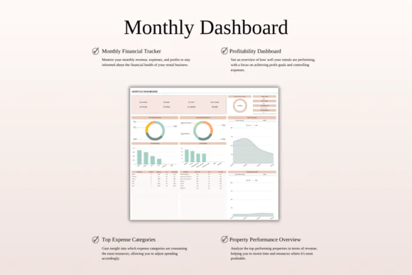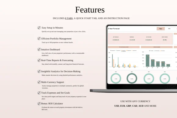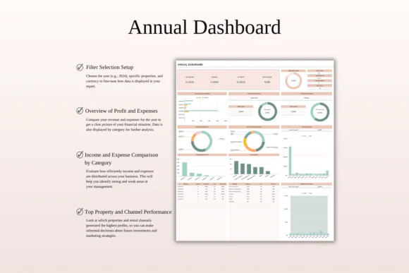 The spreadsheet includes powerful dashboards for monthly performance, annual summaries, property-specific insights, ROI analysis, tax reporting, and 5-year forecasting. You can review income and expenses, compare yearly performance, identify your best-performing property or booking channel, and plan future growth with more clarity.