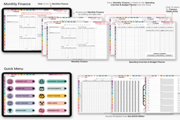 You also get a strong set of finance, wellness, event, travel, and productivity templates. Finance pages cover income and expense tracking, subscription and bill management, and visual spending graphs. Wellness pages include daily habit tracker, sleep and mood logs, gratitude journal, meal planner, and custom wellness templates. Additional sections include wedding planning, event templates, travel preparation, project dashboards, vision boards, brain dump pages, mind maps, and home cleaning or chore routines.