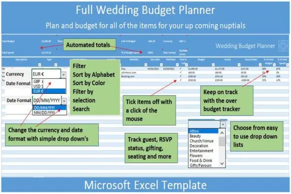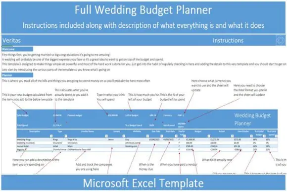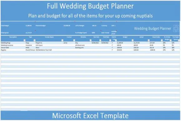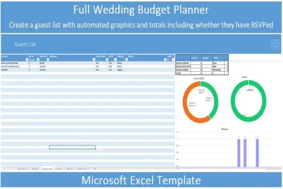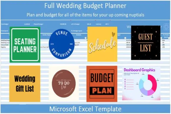 The template includes a detailed planning tab for your wedding budget, spending, and tracking details. You can set budgets, record actual costs, and review where your money is going with a helpful spending dashboard. The dashboard uses graphics to show what you are spending on and whether you are staying within the budgets you set.