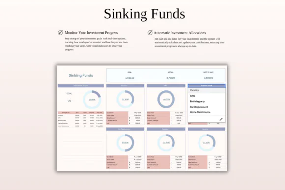 Set savings targets for emergency funds, vacations, investments, large purchases, or personal goals and monitor your progress throughout the year.