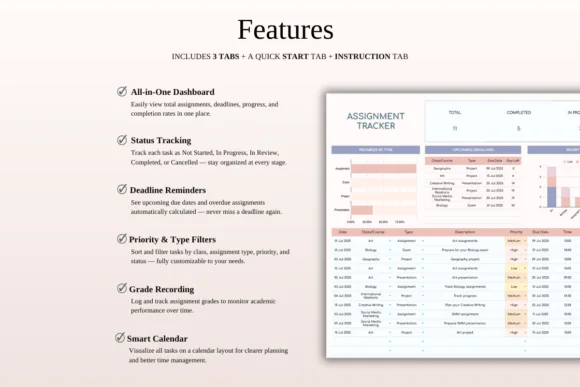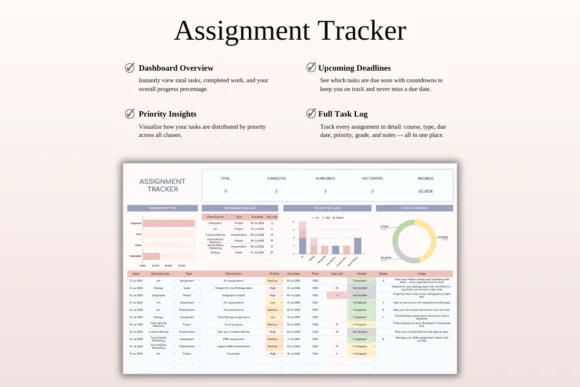 Stay organized, manage deadlines, and reduce academic stress with this Assignment Tracker Spreadsheet Template for Google Sheets and Microsoft Excel. Designed for high school students, college students, university students, undergraduates, and anyone managing academic responsibilities, this spreadsheet helps you keep assignments, exams, projects, presentations, due dates, priorities, and progress in one clear place.