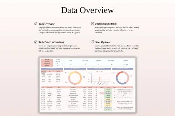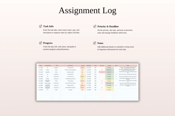 The calendar-style overview helps you prepare for upcoming due dates, while progress tracking keeps you aware of what is completed and what still needs work. Whether you are managing a heavy semester or simply want a cleaner study system, this spreadsheet helps you stay organized and focused.