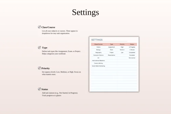 The spreadsheet is designed for students of all levels. Just enter your assignments, due dates, and task details to start organizing.