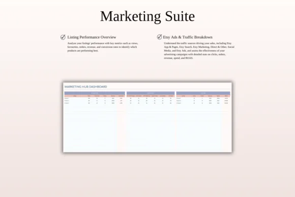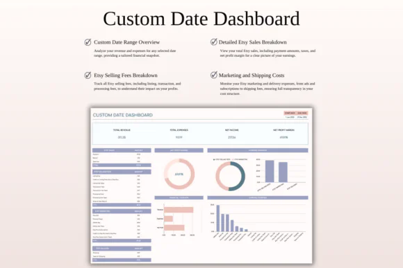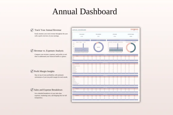 The spreadsheet includes advanced dashboards and analytics to help you track sales, expenses, profits, listing fees, sales tax, profit goals, and business performance. You can review your annual profit and loss summary, forecast future business performance, analyze custom date ranges, and evaluate your marketing efforts through the included Etsy Marketing Hub.