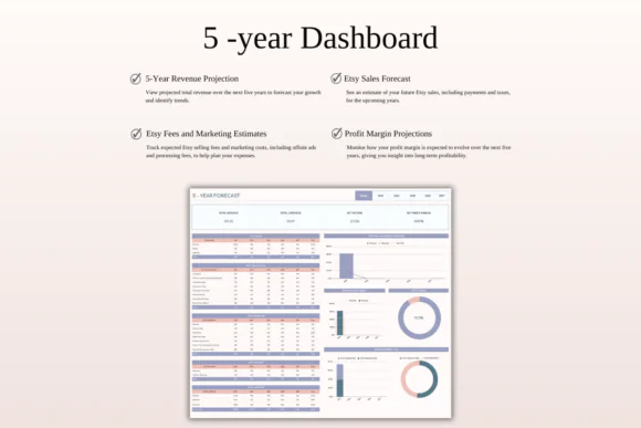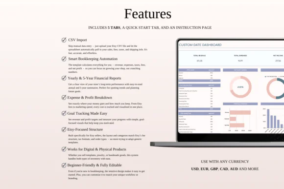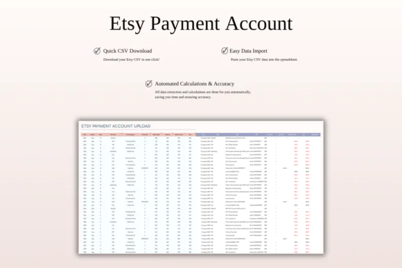 The Automated Bookkeeping Spreadsheet for Etsy Sellers is a practical finance tool for Etsy shop owners who want to save time, reduce manual bookkeeping work, and understand their business performance more clearly. With CSV import support, income and expense tracking, profit dashboards, P&L summaries, marketing tools, and 5-year growth analytics, this spreadsheet helps you manage your Etsy shop finances with confidence.