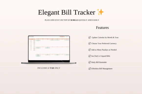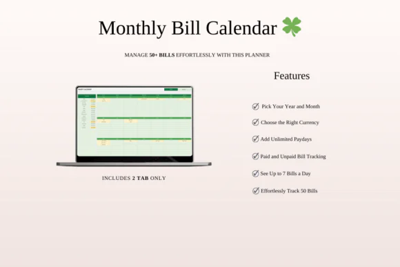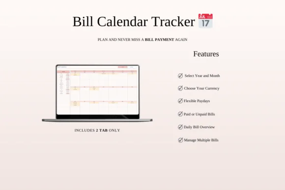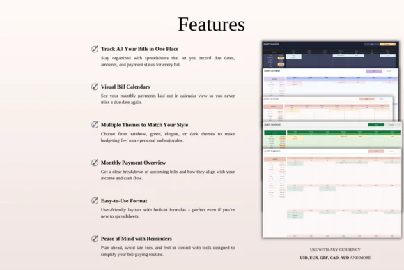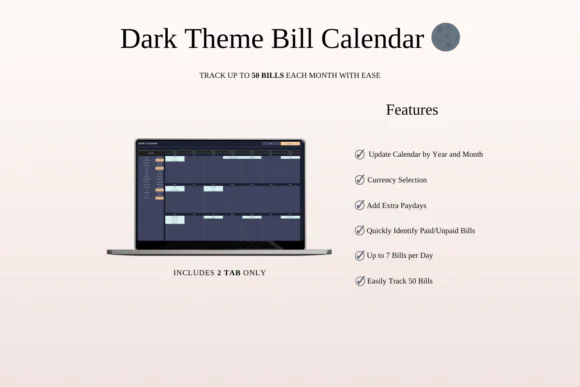 This bundle includes five unique bill tracker designs: Rainbow Bill Tracker, Green Monthly Bill Calendar, Elegant Bill Tracker Calendar, Dark Mode Bill Payment Calendar, and Classic Bill Calendar Tracker. Each template is created to help you monitor bills, due dates, payment amounts, payment status, and recurring expenses in one simple place.