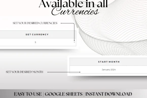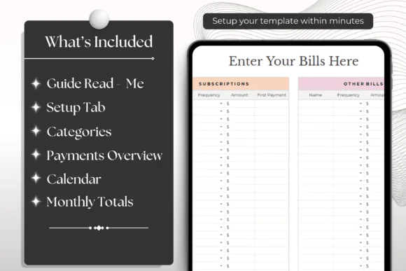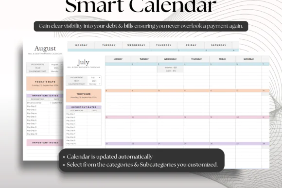 The template includes dedicated tabs for setup, categories, transaction logging, calendars, and monthly totals. You can customize your currency, define bill categories and subcategories, track important dates, choose calendar settings, and view monthly summaries for bills, subscriptions, other expenses, and debts. The automatic calendar works for any year and allows you to start the week on either Sunday or Monday.