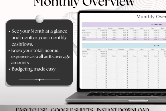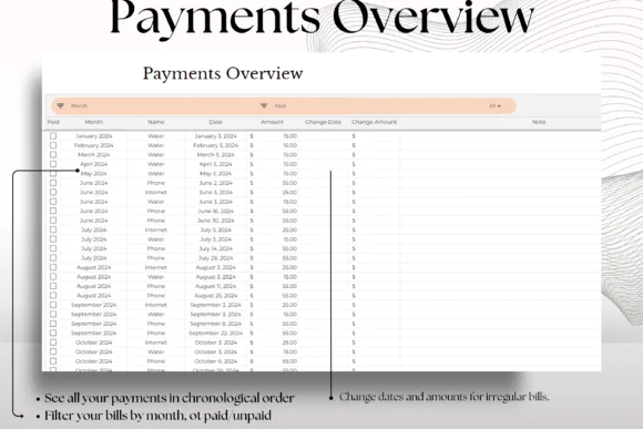 Personal finance tracking, household budgeting, bill payment planning, subscription management, monthly expense tracking, debt payment reminders, due date organization, family budget planning, recurring payment tracking, and financial organization.
