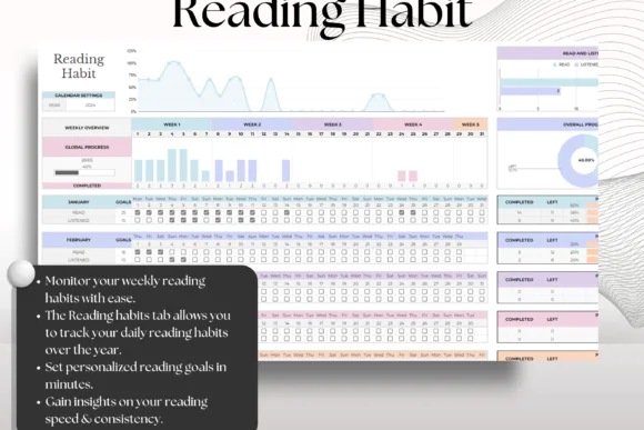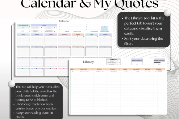 This template also includes a library section with icons for “to read,” “currently reading,” and “completed,” plus a reading habits tracker where you can set monthly reading goals and mark the days you read or listened to a book. The calendar tab helps you visualize daily reading habits, borrowed book return dates, and upcoming publication dates in one organized view.