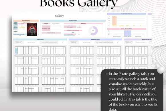 The included dashboard gives you a clear overview of your book collection and reading progress. You can search for specific books using filters, view detailed information for selected titles, and track reading progress by year. The photo gallery and gallery tabs allow you to view books visually with cover images, organize books into owned, borrowed, and upcoming publication sections, and display your collection like a virtual bookshelf.