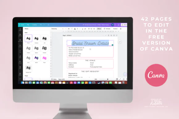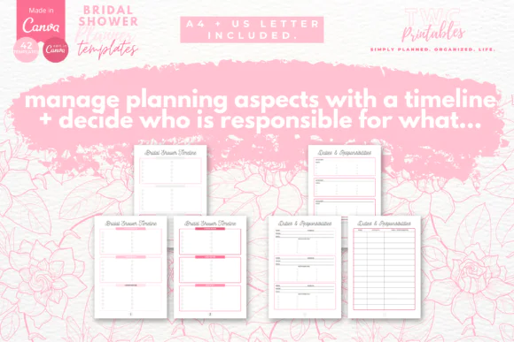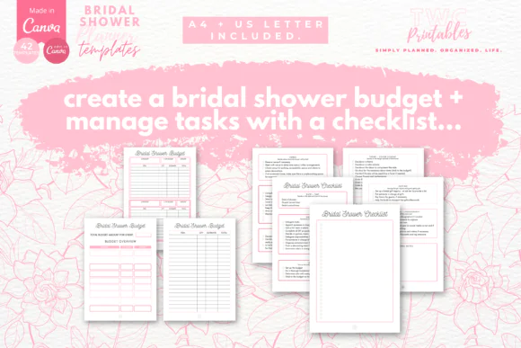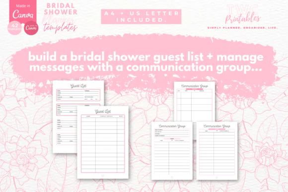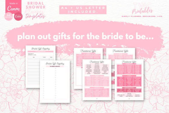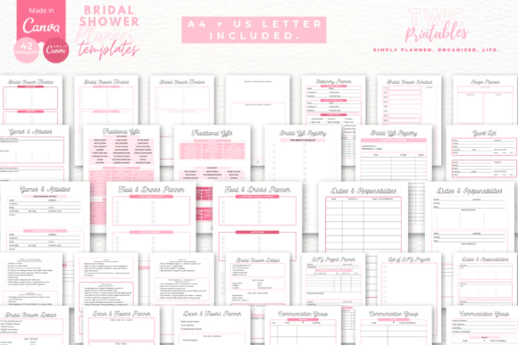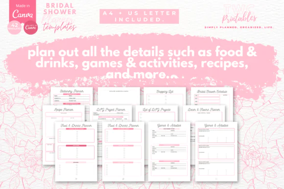 This bundle includes 42 editable Canva templates in A4 and US Letter sizes, making it convenient for both digital editing and printing. The planner comes in a lovely pinks design theme, and it can be fully customized in the free version of Canva. You can change fonts, colors, elements, shapes, and layouts to match your preferred bridal shower style, theme, or branding. A free Canva guide for beginners is also included, which makes it especially helpful for users who are new to editing templates.