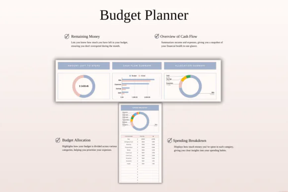 The Budget Planner Spreadsheet for Excel and Google Sheets is a practical, beginner-friendly finance tool that helps you organize your money with confidence. With automated calculations, visual graphs, customizable categories, and goal tracking, this template gives you a clear and simple system to stay on budget and reach your financial goals.