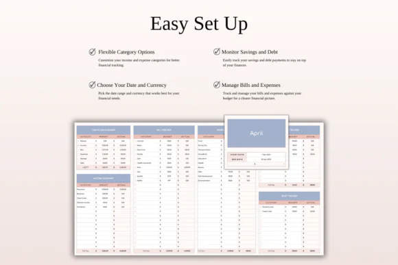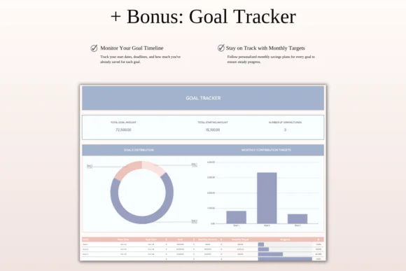 This template also includes helpful checkboxes for bills, debt, and savings tracking, plus a bonus Goal Tracker tab to keep you motivated as you work toward savings goals, debt payoff targets, emergency funds, or other personal finance milestones.