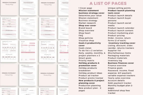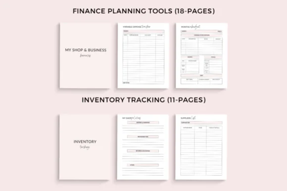 For day-to-day business operations, the bundle includes useful management pages such as order forms, invoice forms, return forms, inventory trackers, listing trackers, discount trackers, supplier list, packaging materials, product materials, inventory log, and several finance-related sheets. The finance section includes finance overview, finance goals, income tracker, fixed expense tracker, bill payment tracker, variable expense tracker, yearly sales overview, account details, debt payment tracker, monthly budget plan, and additional shop fees tracker. This makes it a strong all-in-one business organization tool for sellers who want better control over operations and finances.