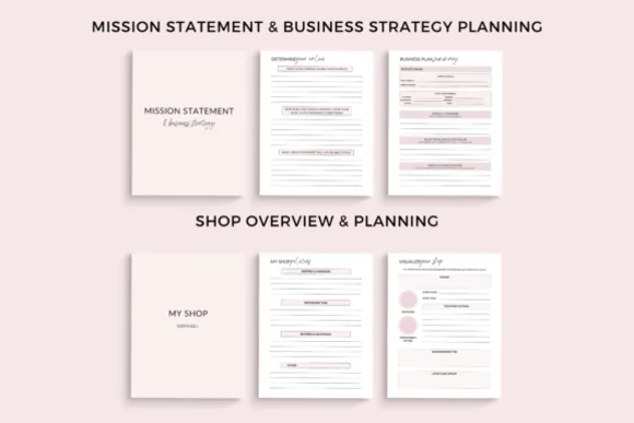 This bundle includes 82 Canva templates, with 11 pages dedicated to cover pages and section dividers, creating a polished and professional planner structure. Inside, you’ll find sections for mission statement, business strategy, market research, brand board, shop overview, shop policies, FAQ, goals and vision, to-do lists, daily, weekly, monthly, and project planners, SMART goals, and priority matrix. These pages help business owners map out their purpose, organize operations, and stay focused on both short-term tasks and long-term growth.