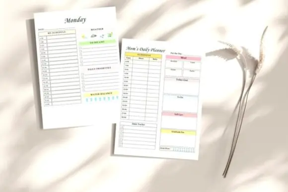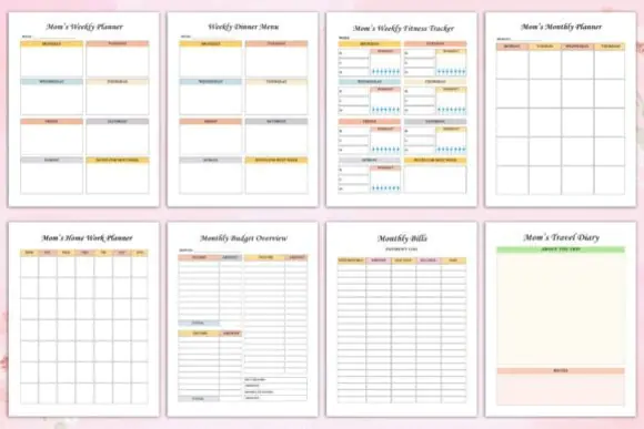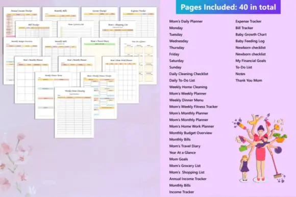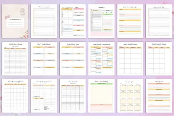 The planner includes thoughtfully designed pages that support real mom life, from hour-by-hour scheduling and daily priorities to baby feeding logs, financial overviews, cleaning checklists, hydration tracking, gratitude practice, and family goal setting. It is ideal for moms who want to stay organized without feeling overwhelmed.