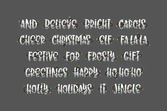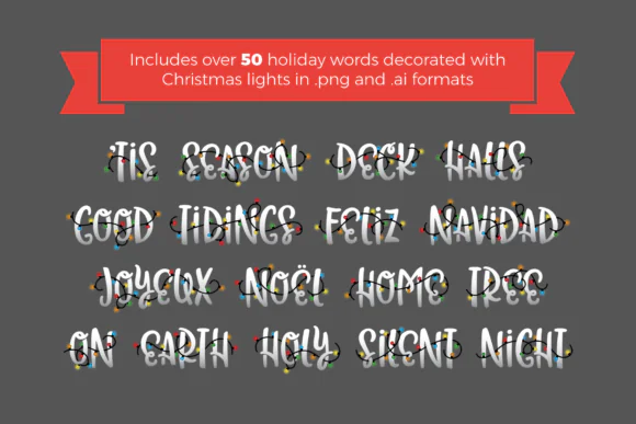 This font is perfect for projects that need a strong, cheerful, and decorative Christmas look. The pack includes holiday words decorated with stringed lights, making it ideal for festive typography, Christmas posters, greeting cards, invitations, t-shirt designs, mugs, stickers, wall art, sublimation projects, product labels, packaging, and digital graphics.