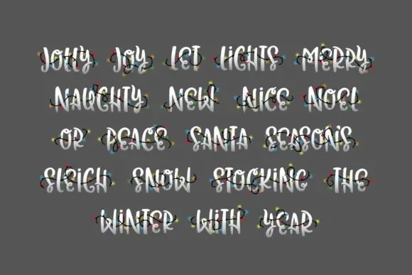 Christmas Lights Font brings the joyful feeling of glowing holiday decorations into your designs. Its bold uppercase style makes headlines, quotes, and seasonal messages stand out clearly, while the light-decorated words add a fun and creative Christmas touch.