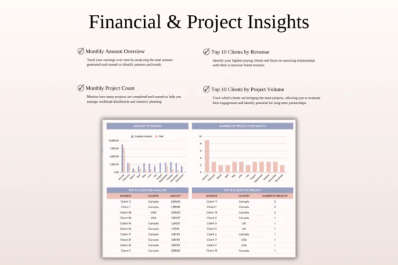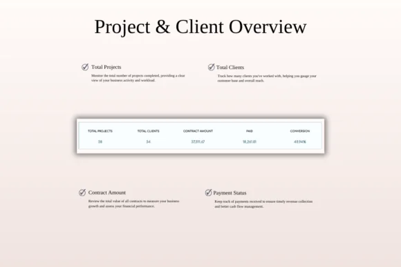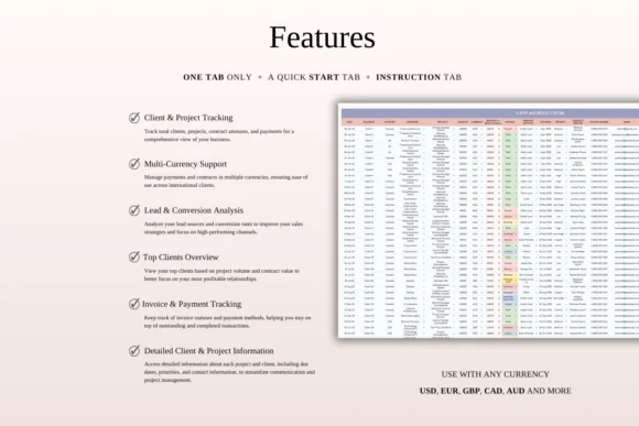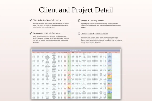 Whether you work with local clients or international customers, this spreadsheet helps you stay organized and financially aware. With multi-currency support, invoice tracking, payment records, project progress views, and customizable client fields, you can manage your workload more confidently and provide better service.