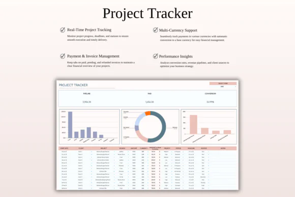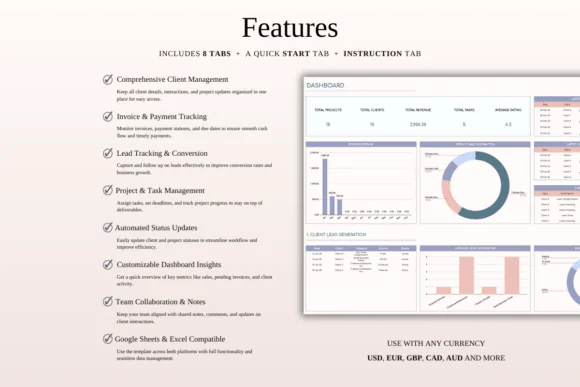 Compatible with both Google Sheets and Microsoft Excel, this CRM template is flexible, editable, and accessible across devices.