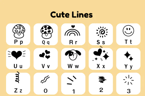 Add a sweet, playful, and friendly touch to your creative projects with Cute Lines Font, a charming dingbat font designed to bring simple decorative style to your designs. With its cute line-based appearance and easy-to-use dingbat format, this font is perfect for creators who want to add fun visual accents, small illustrations, borders, dividers, and decorative elements to their layouts.